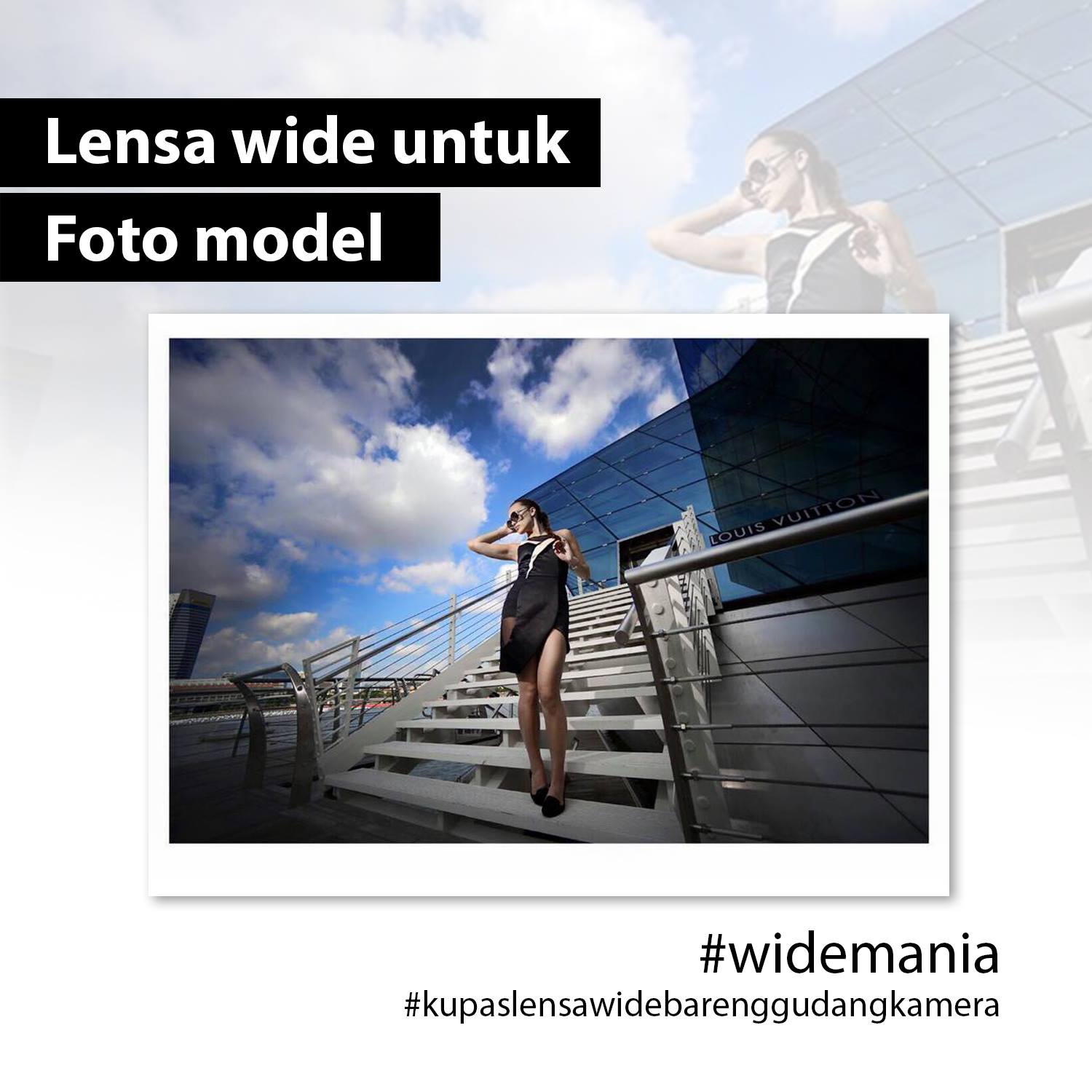 Lensa tele biasanya lebih umum dipakai untuk memotret seorang model. Namun, dengan menggunakan lensa wide, kita bisa juga tetap berkreasi, dan tentunya akan menghasilkan gambar yang lebih unik dibanding fotografer lainnya yang hanya menggunakan lensa tele. Lensa wide yang popular untuk foto model adalah lensa 16-35mm, 24-70mm, 35mm, ataupun 24mm fixed