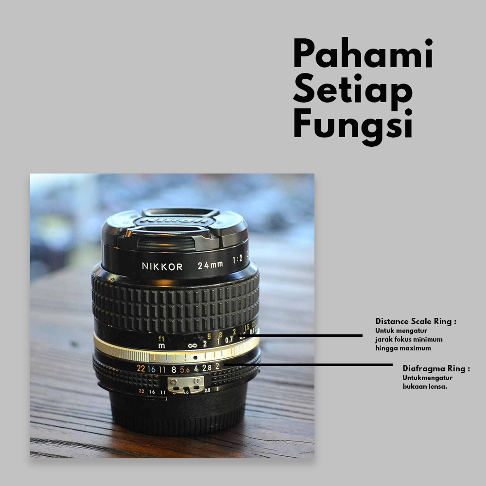 Secara body lensa manual emang identik dengan ring jarak fokus dan juga ring diafragma. Ring jarak fokus ini untuk menentukan jarak fokus antara user dengan objek. Misalnya sobat GK mengatur ring fokus pada angka 0.5 itu berarti sobat GK akan mendapatkan objek fokus dengan jarak antara objek dan user sejauh 0.5 meter.